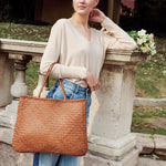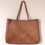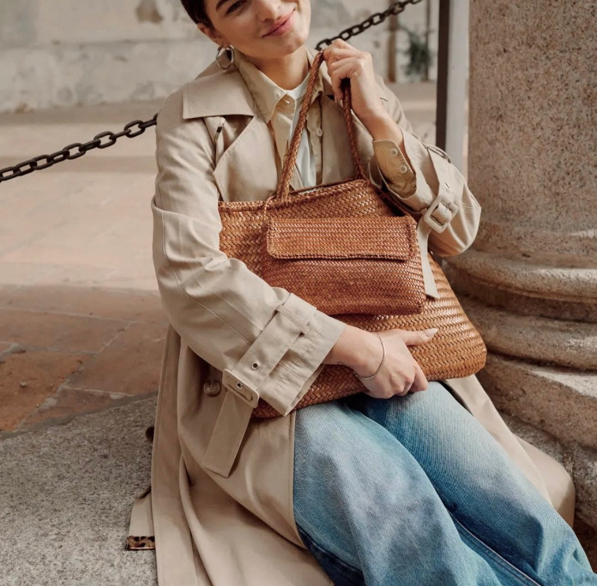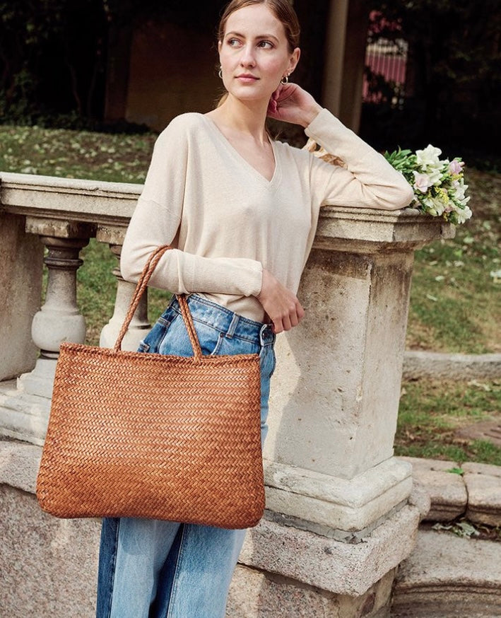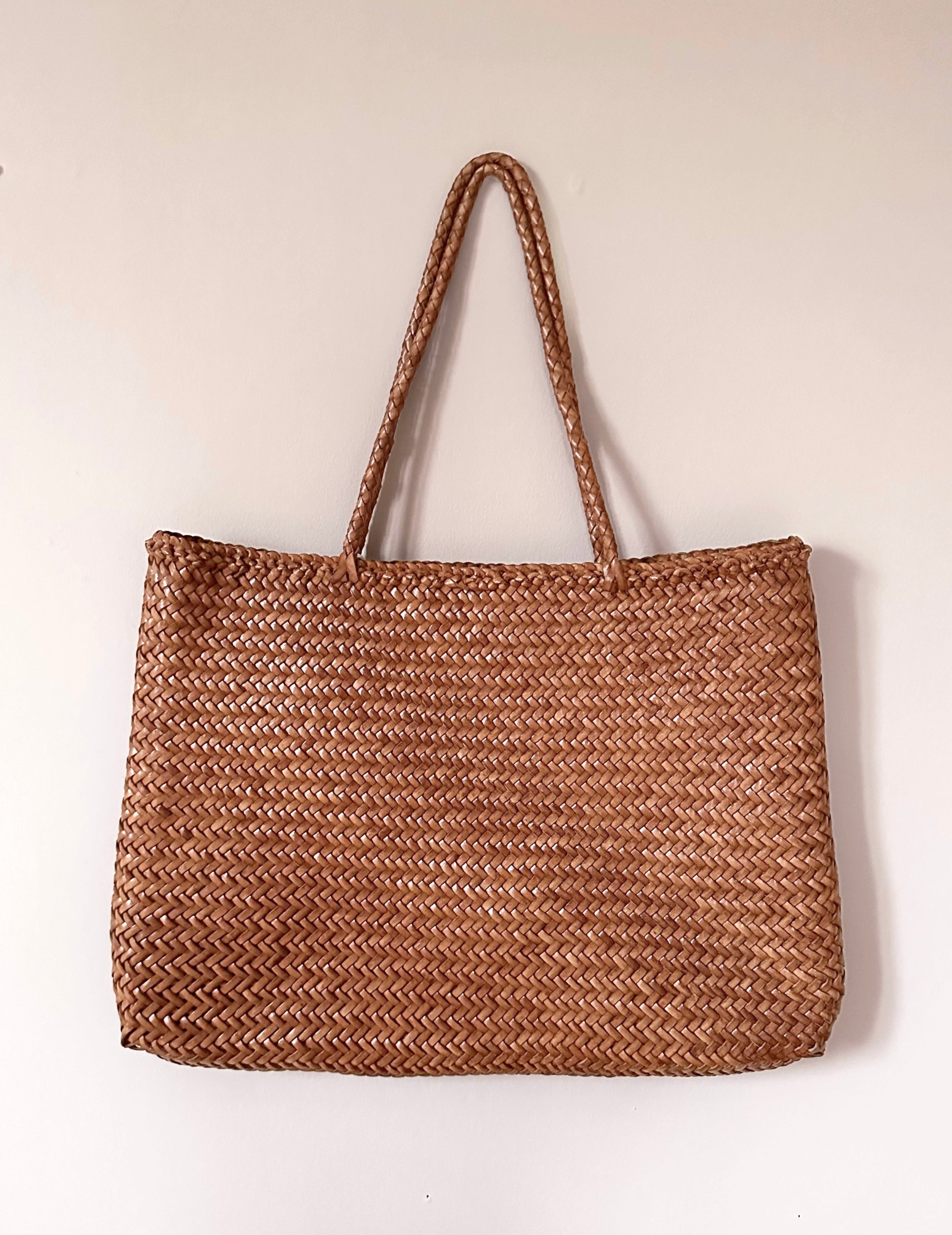 A roomy, hand-woven bag in smooth, buffalo calf leather. Handcrafted by artisan weavers in one piece. And, remaining true to traditional basket weaving techniques, the bag comes unlined with an open top.