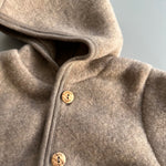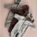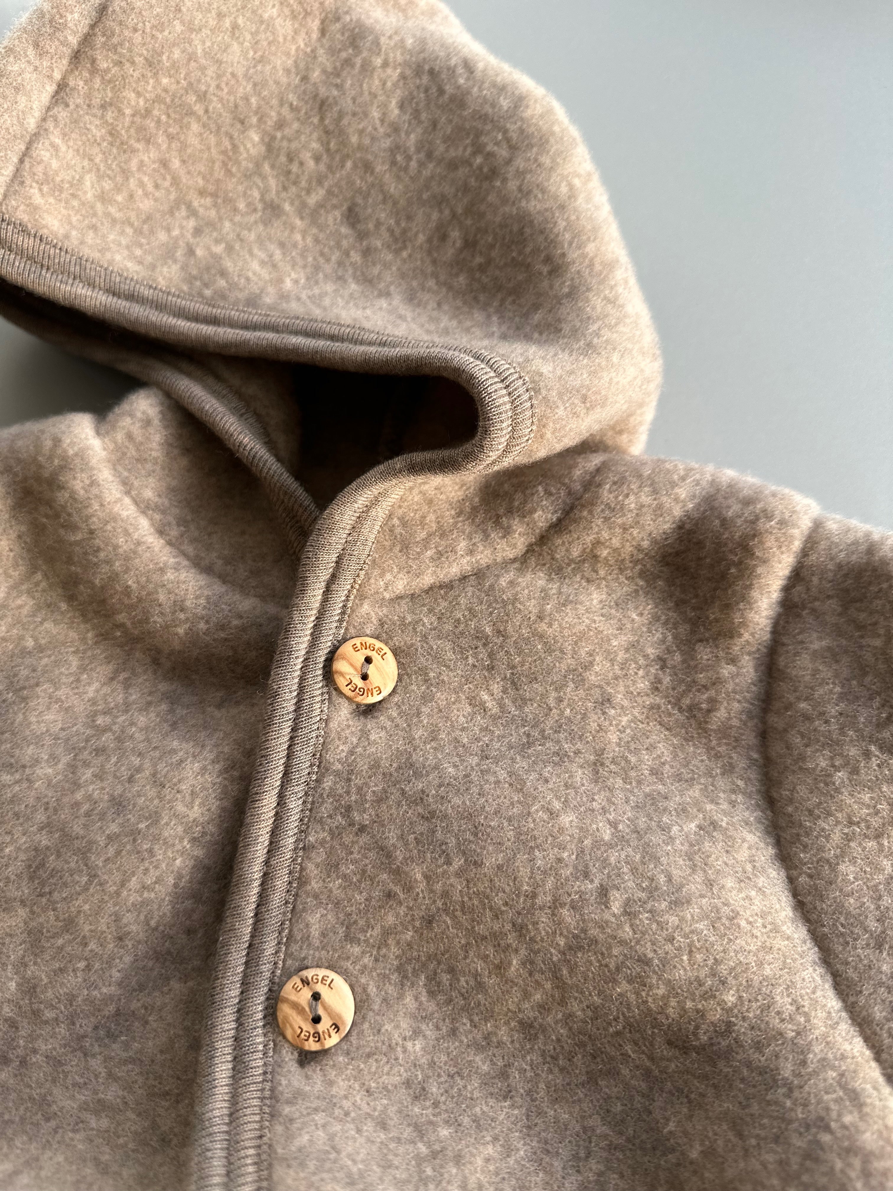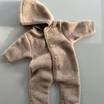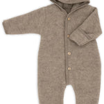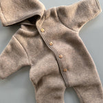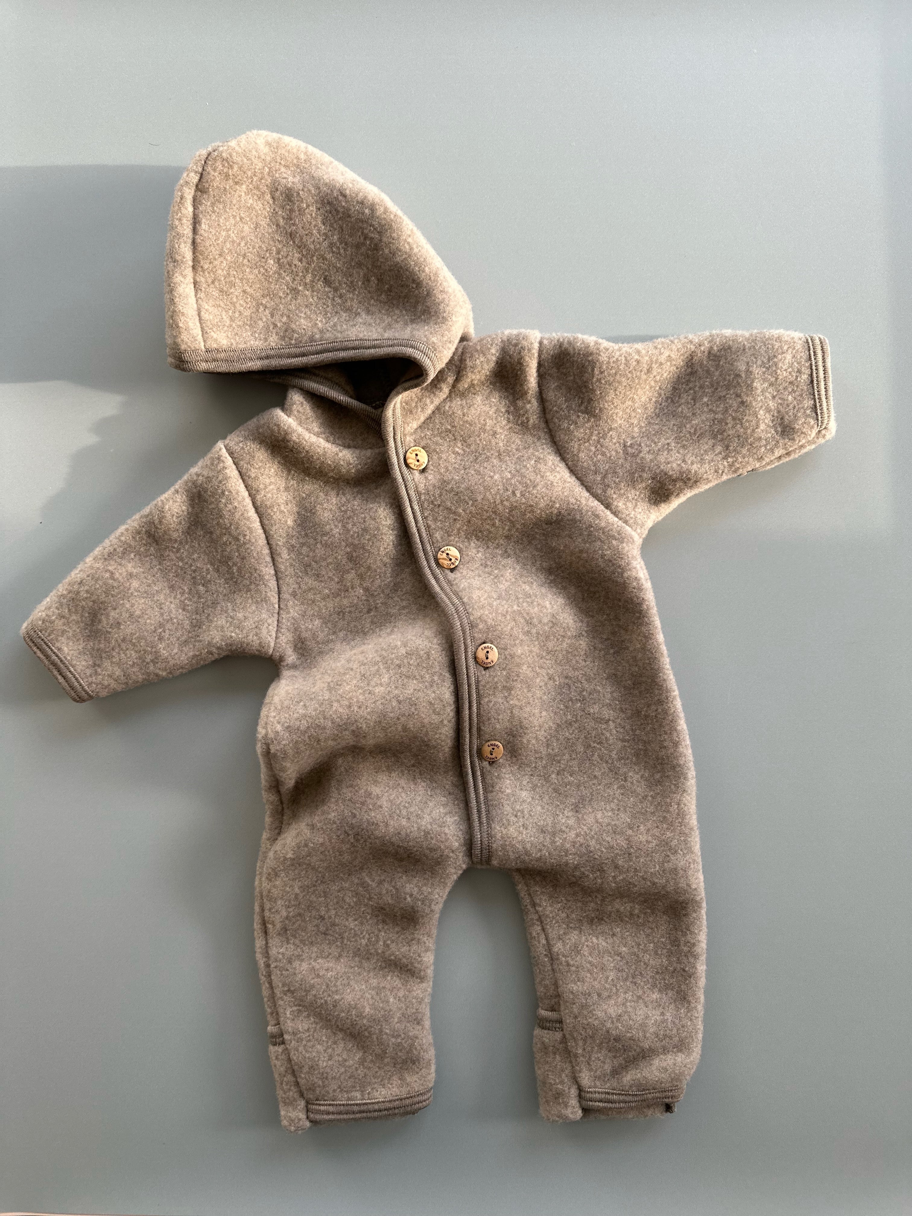 A must-have for all parents: the baby fleece hooded overall made of 100% organic virgin wool keeps baby snuggly and warm all over. The cuffs at legs and arms can be conveniently folded over the little hands and feet. This way, the offspring is always perfectly protected from the cold. When  the cuffs are not folded over, the overall wonderfully grows along .