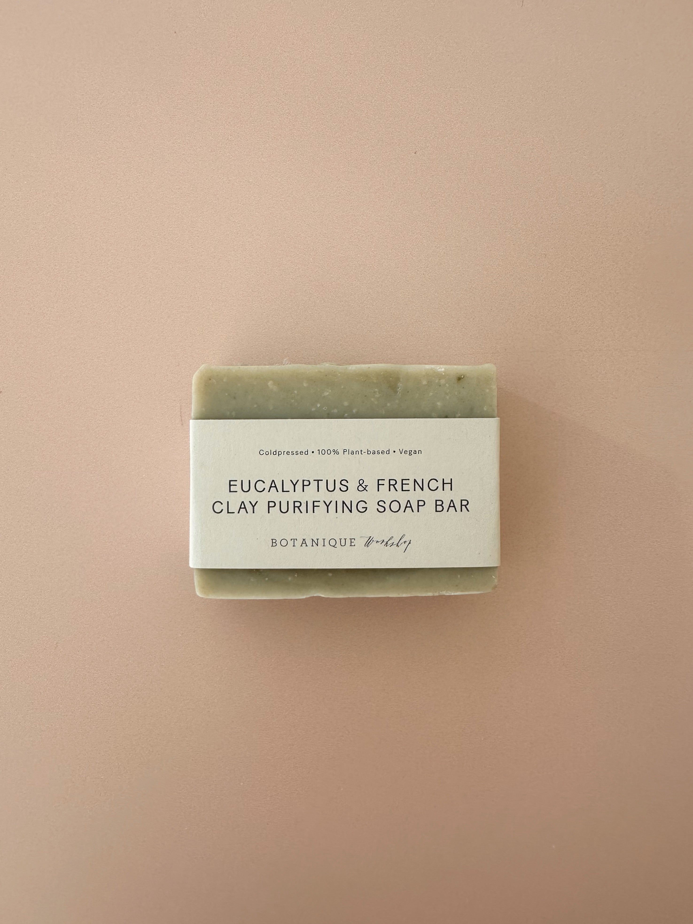 A skin purifying bar of soap made in Botanique's London workshop with 100% natural ingredients; french clay and olive oil, each bar is packed with moisturising shea butter and coconut oil. Blended with 100% pure essential oils (eucalyptus and rosemary).